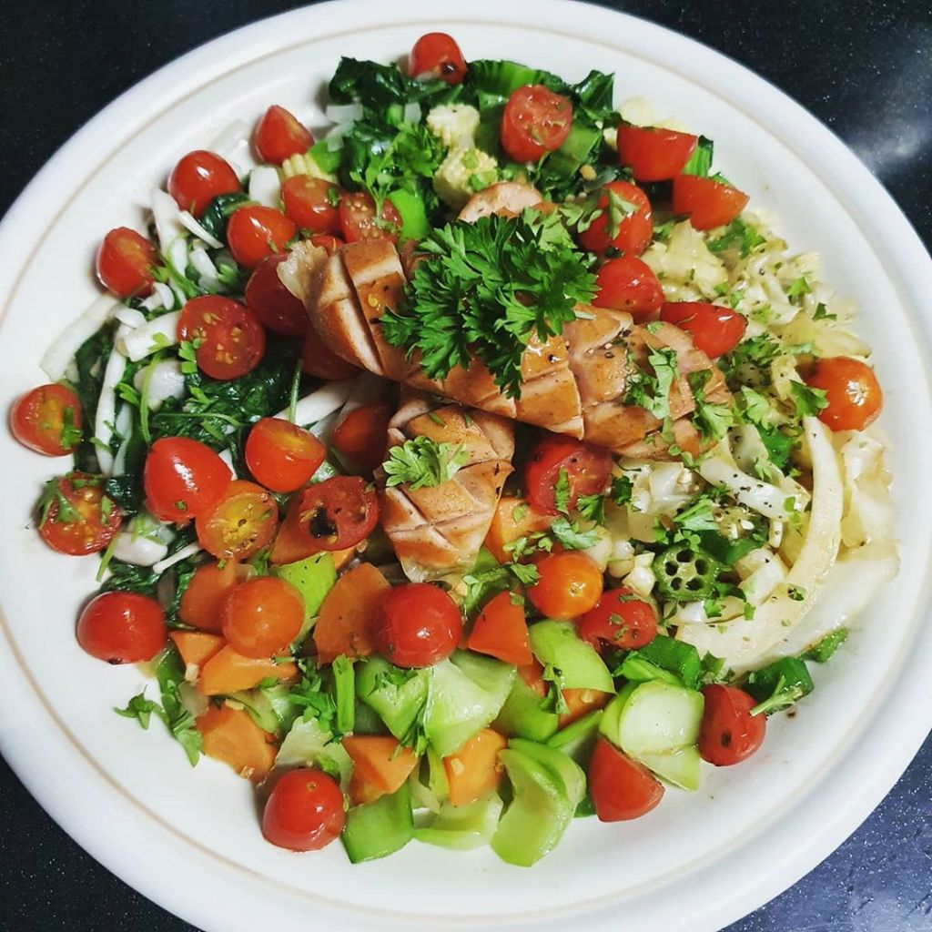Ingredients: Chicken sausage, carrot, spinach, mushroom, baby corn, cabbage, lady finger, cherry tomato, Shanghai bok choy, parsley, garlic flake, butter.