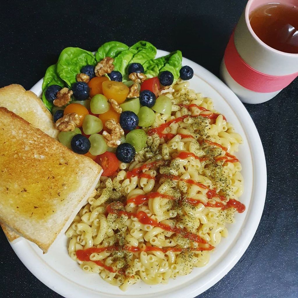 Review: Simple, fast, easy, hazard free dinner. Extremely suitable for you to make when you don’t feel like spending too much time and effort on dinner. Little effort yields you a wonderful and fulfilling results. The pasta idea is from traditional spaghetti carbonara, which consist of pancetta , egg, Parmesan cheese, and olive oil. I simplified it because I don’t want take in too much oil at night, yet it still tastes gorgeous. I forgot to buy any meat, so I use garlic toast to be the chewy element. Then it becomes a vegetarian meal.😂